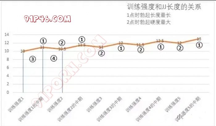 ②是勃起硬度最高的时候,其中长度会比在①点的时候短,但是会比上一个训练周期的②点长。JJ就是在一个个训练强度中不断增大的。到达②点表示PC肌已经完全适应了这个训练强度,可以进行下一个周期的训练。