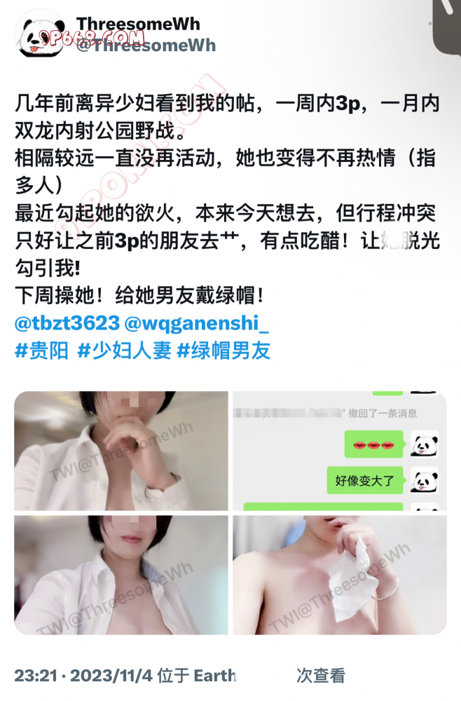 最近跟她聊天,总想勾引她同意跟我和小P一起(因为她有了新男友,我是不是很贱?哈哈哈哈,就想给别人戴绿帽),屡屡失败!好不容易她最近松口了,因为男朋友出差了,实在是耐不住我给她发以前的帖子视频勾引,终于同意了。