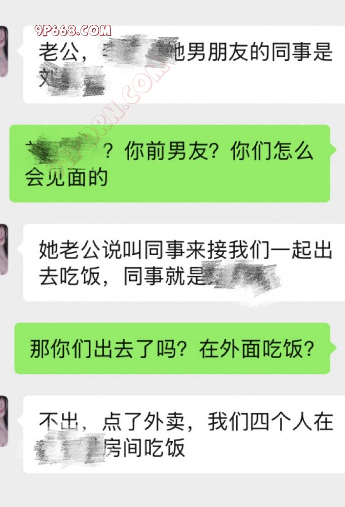 趁着暑假老婆跟同事外出旅游,加上老婆一共三个人,到了最后一站目的地的当天,其中一位同事(简称A)跟是男朋友(简称B)异地恋,老婆旅游的目的地就是这位同事老公所在的地方,另一位同事要去探亲,下了动车这位同事就跟老婆两人分开了,打算第二天跟老婆她们汇合。所以当晚的计划是同事A及她的老公B给老婆接风洗尘,(因为A是跟老婆一起来的,就一起定了同一家酒店,两间连着的房间)B将老婆跟同事A送到酒店之后打算休整一下就出门吃饭,老婆说在酒店的时候已经听到隔壁A跟B在打炮的声音了。傍晚的时候A跟B叫上老婆去吃饭,B说他的同事C接她们出门吃饭,一起过来的还有B的同事C,C居然是老婆的前男友,见上面时老婆跟C都有点尴尬,只能跟同事A说两人是以前的同学,而A跟B听到后觉得大家都认识,而且老婆的同事A说坐了这么久的车都累了,要不就不要跑来跑去了干脆在酒店房间点外卖吧,还可以休息一下。于是ABC三人加上老婆就在A的房间点外卖解决晚餐,还点了几箱啤酒,四个人一遍聊天一边喝,很快就到了深夜,期间C抓到机会就夸老婆读书的时候是多漂亮多校花,是多少人的白月光,老婆说吃饭期间C一直盯着她看,喝到后面老婆已经有点上头了,趁着AB两人下楼买烟的间隙。C跟老婆说这些年有多不容易,有多想老婆。说自己感情不顺,说着说着眼眶都湿了(其实都是演的,千言万语就是想上床…),老婆也有一点触动。等到AB回来之后,老婆说自己喝多了先回房间休息,而C也称自己不当电灯泡也要走了,老婆就回到房间休息,没想到C走了之后又返回来,在老婆房间门口给老婆打电话,问老婆能不能再聊聊天,老婆也察觉到C对她有想法,就给我发了信息,下面是聊天记录